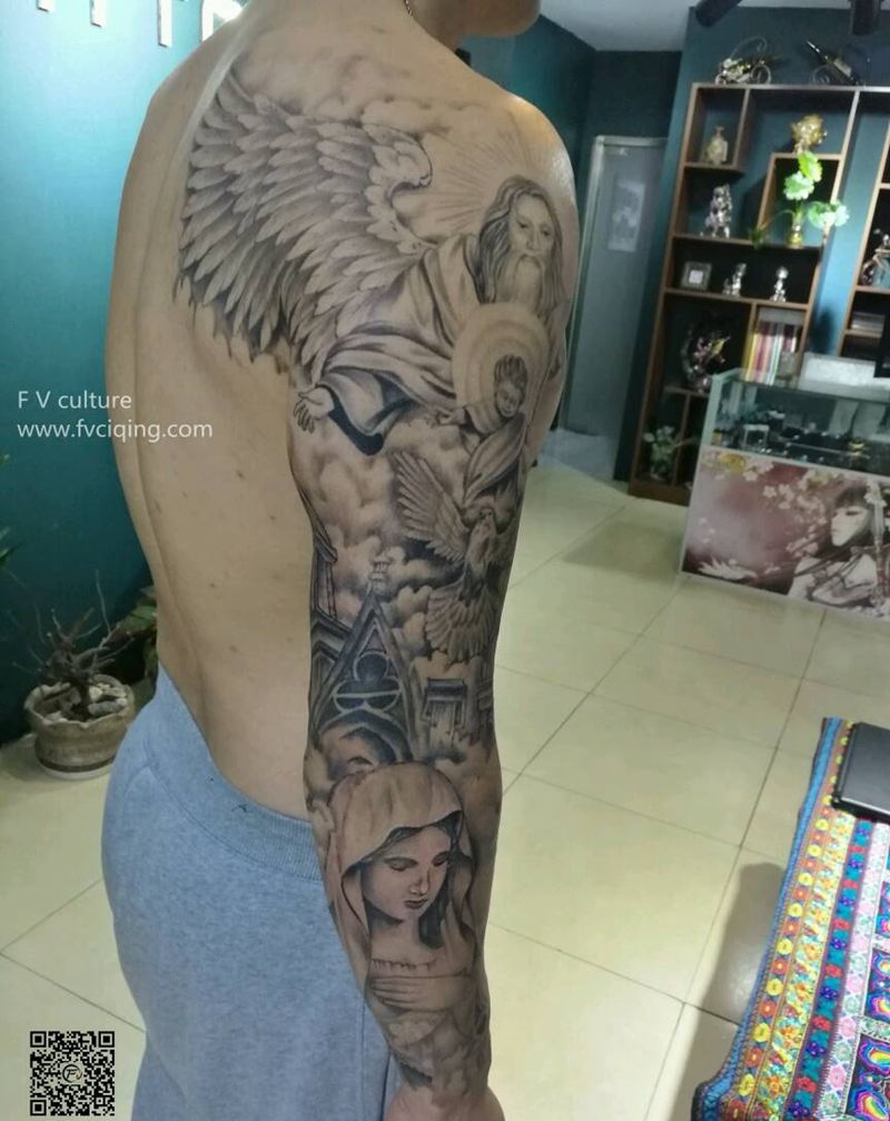 欧美花臂纹身图片_手臂欧美人物鬼神宗教青岛FV纹身图案