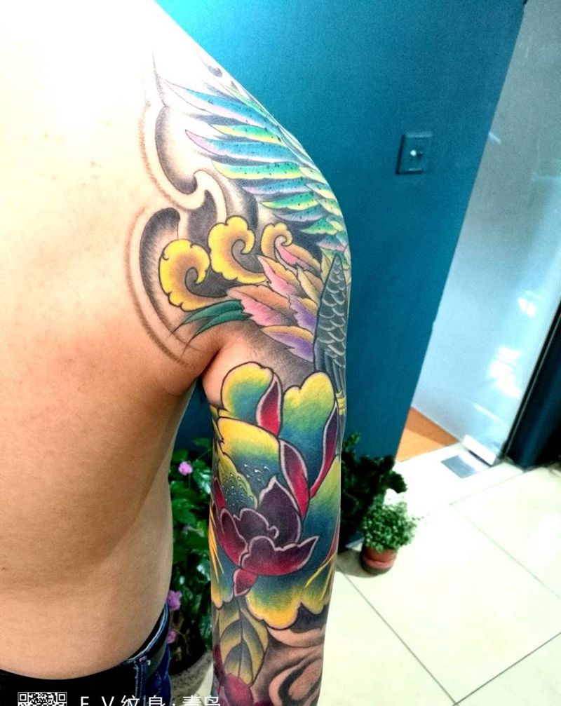 大臂凤凰纹身纹身图片_手臂传统动物青岛FV纹身图案
