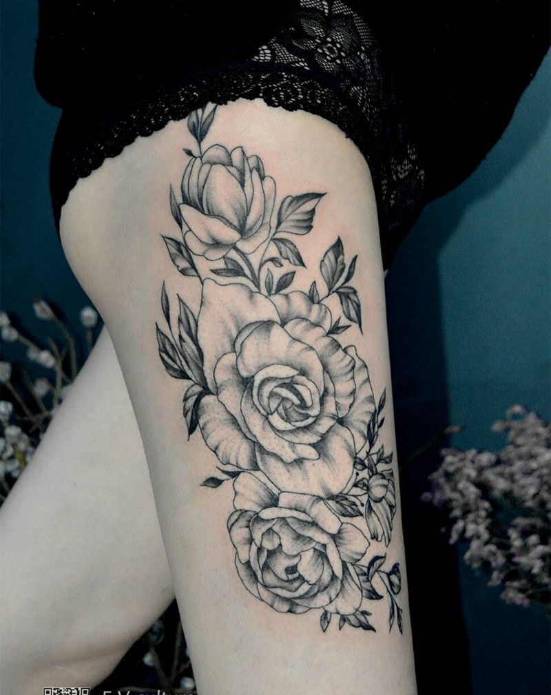 大腿欧美玫瑰花纹身纹身图片_腿部欧美清新植物青岛FV纹身图案