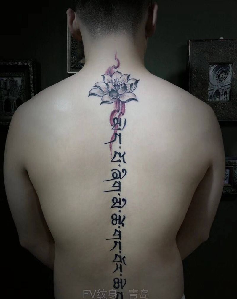 脊骨梵文纹身图片_背部传统字符青岛FV出品纹身图案