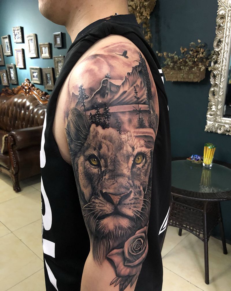 当前位置: 首页 >山东省青岛市纹身店-FV 纹身 艺术区纹身图案>大臂写实狮子纹身图片_手臂纹身图案