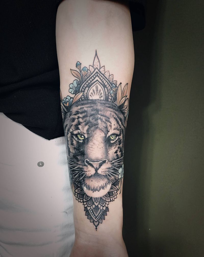 小老虎,遮盖了之前的字母纹身图片_手臂纹身图案
