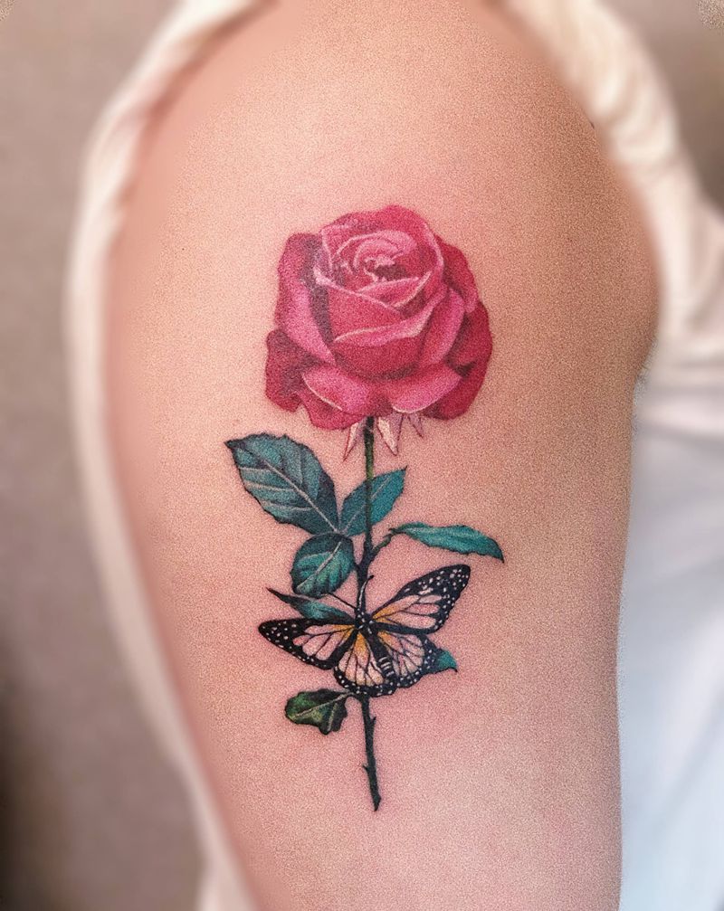 彩色写实纹身图片_手臂欧美写实水彩花蝴蝶玫瑰纹身图案