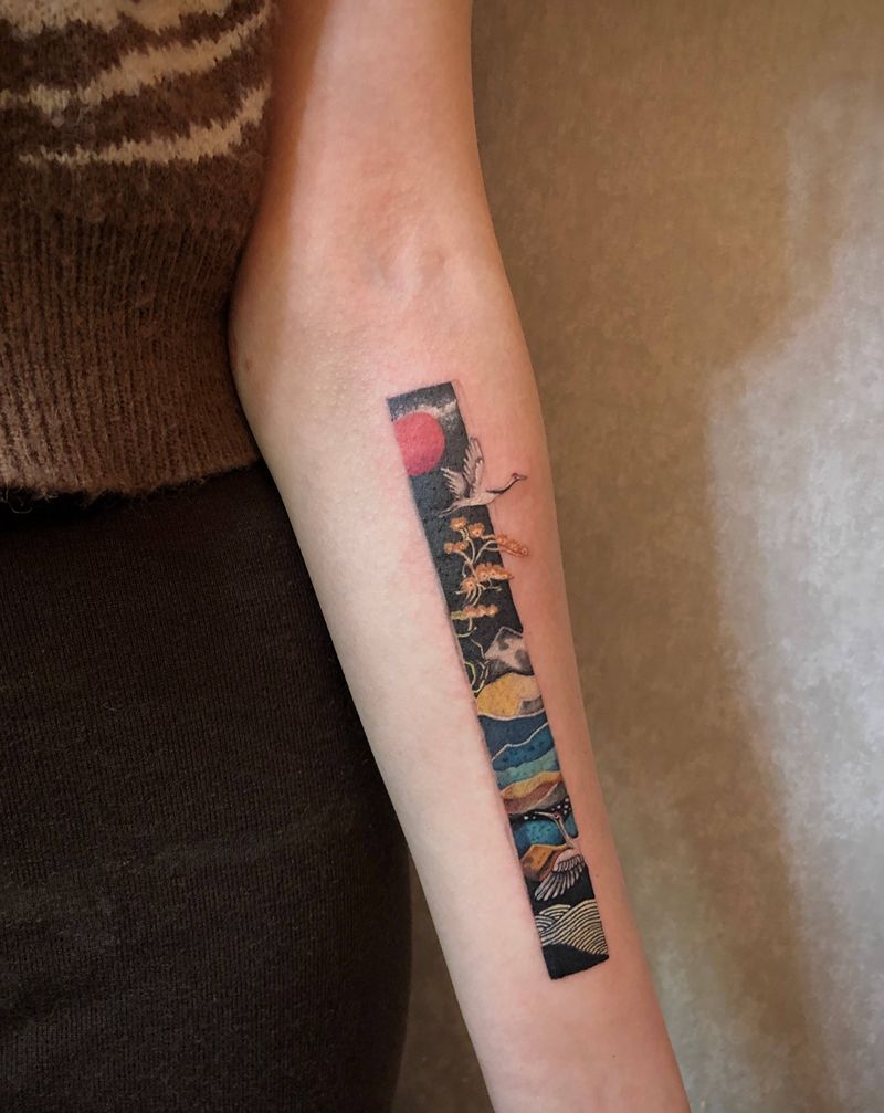 当前位置: 首页 >山东省青岛市纹身店-山石刺青纹身图案>国风精雕遮盖纹身图片_手臂水彩水墨鹤精雕纹身图案