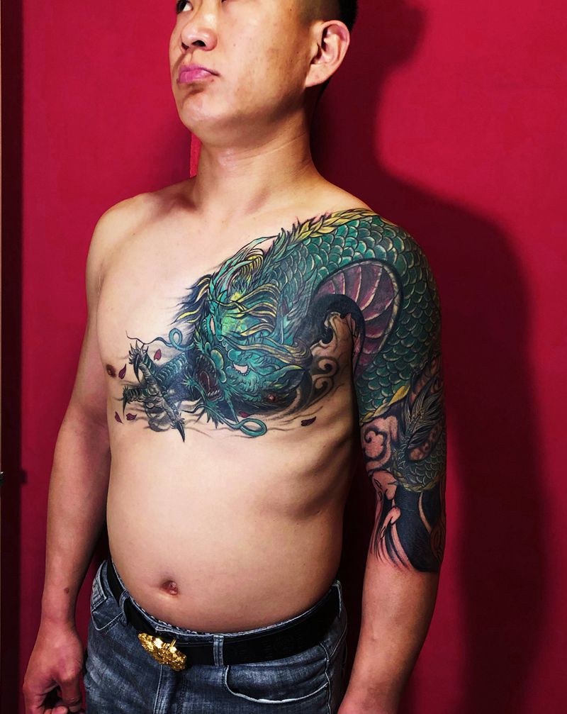 当前位置: 首页 >山东省淄博市纹身店-韵刺青纹身工作室纹身图案>暴力遮盖过肩带鱼纹身图片_胸部手臂纹身图案