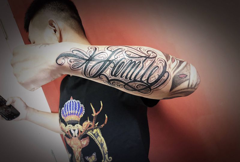 当前位置: 首页 >山东省淄博市纹身店-韵刺青纹身工作室纹身图案>小臂卡其诺花体 “家庭”纹身图片_手臂纹身图案