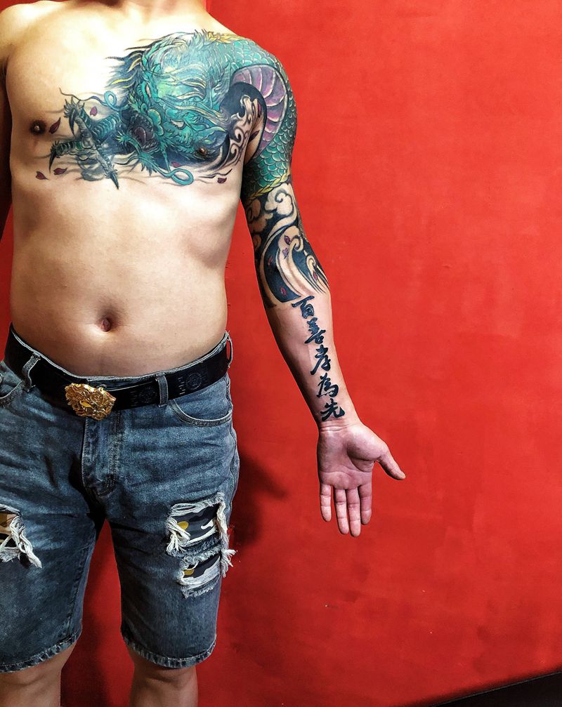 • T网红王老大花腿龙纹身图片_腿部新传统纹身图案