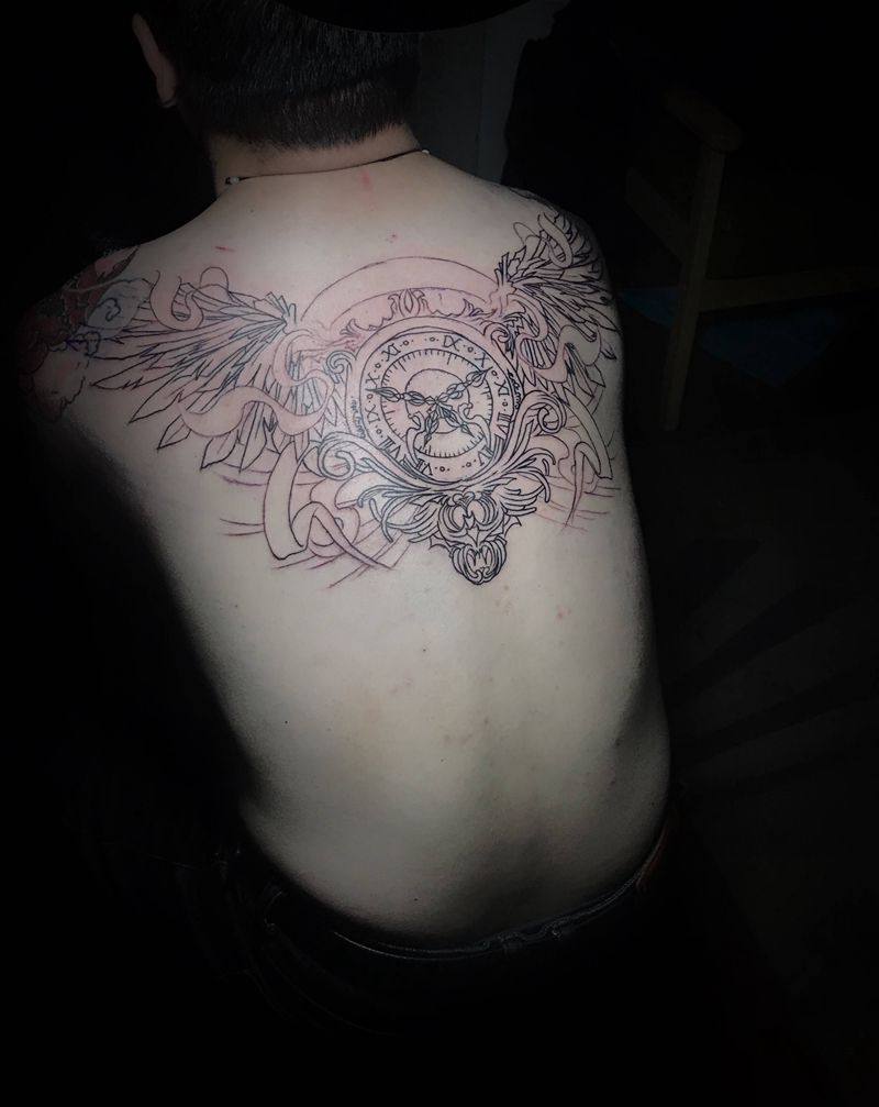 当前位置: 首页 >山东省淄博市纹身店-韵刺青纹身工作室纹身图案>后背时间轮回翅膀纹身图片_背部纹身图案