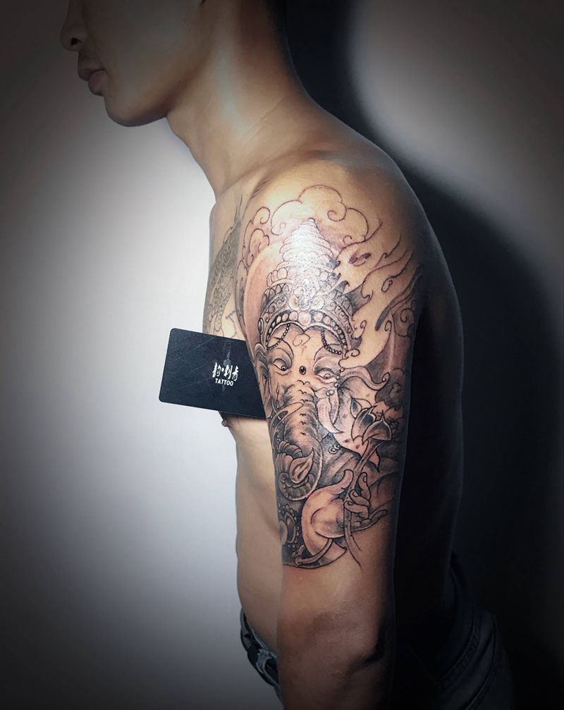 当前位置: 首页 >山东省淄博市纹身店-韵刺青纹身工作室纹身图案>大臂象神一次完成纹身图片_肩部纹身图案