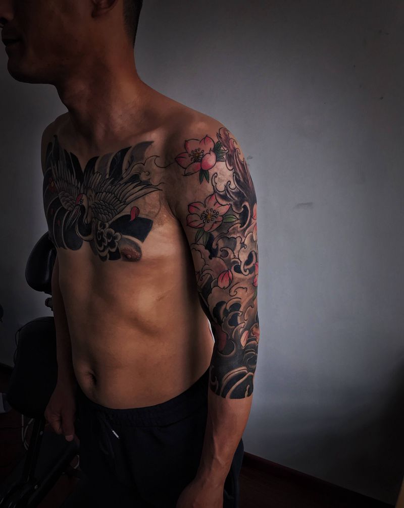 当前位置: 首页 >山东省淄博市纹身店-韵刺青纹身工作室纹身图案>日式花胸,七分袖纹身图片_胸部手臂纹身图案