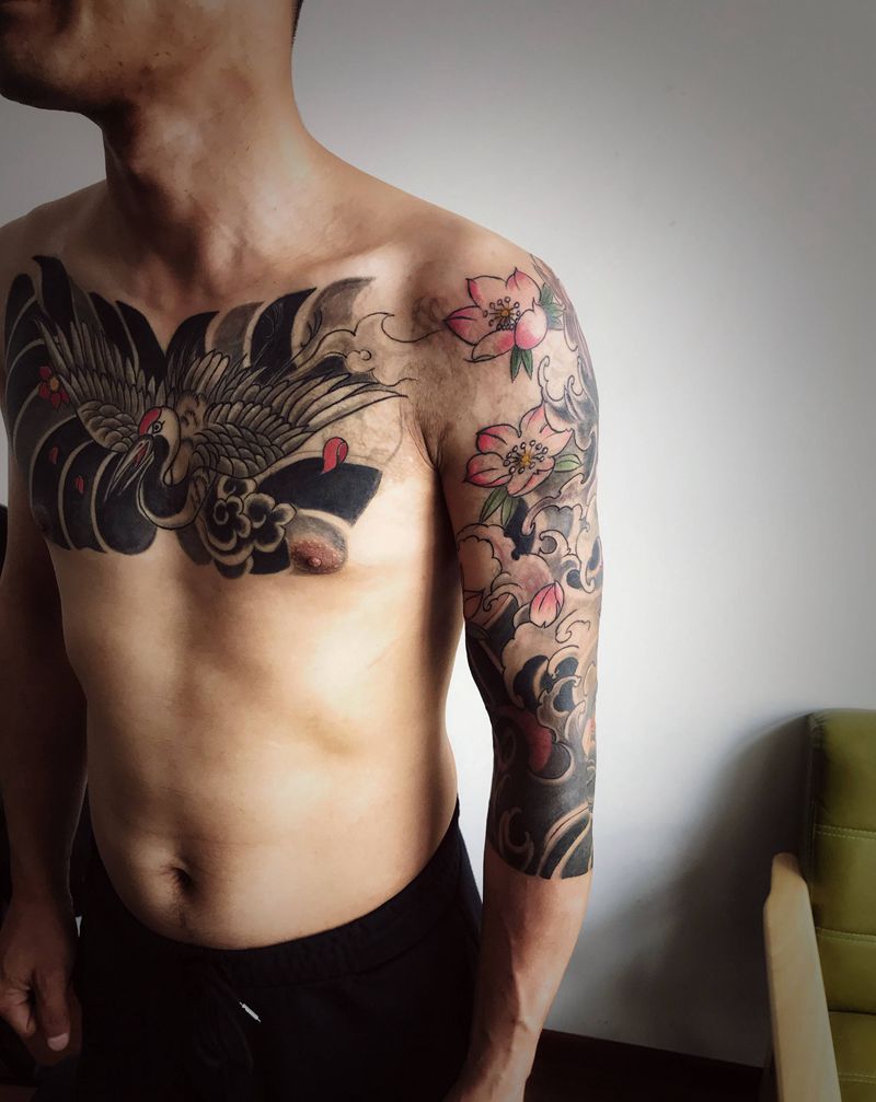 日式花胸,七分袖纹身图片_胸部手臂纹身图案