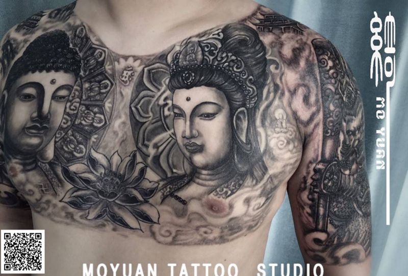 当前位置: 首页 >山东省淄博市纹身店-纹绮刺青工作室纹身图案>前胸大日如来和修改的菩萨纹身图片