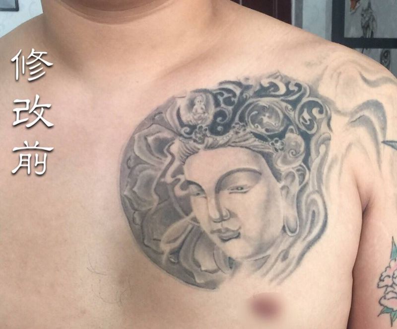 当前位置: 首页 >山东省淄博市纹身店-纹绮刺青工作室纹身图案>前胸大日如来和修改的菩萨纹身图片