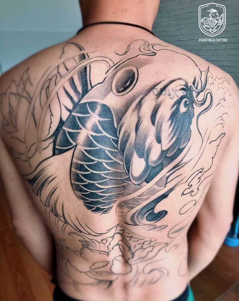 鲤鱼(蜕皮中)纹身图片_背部新传统鲤鱼纹身图案