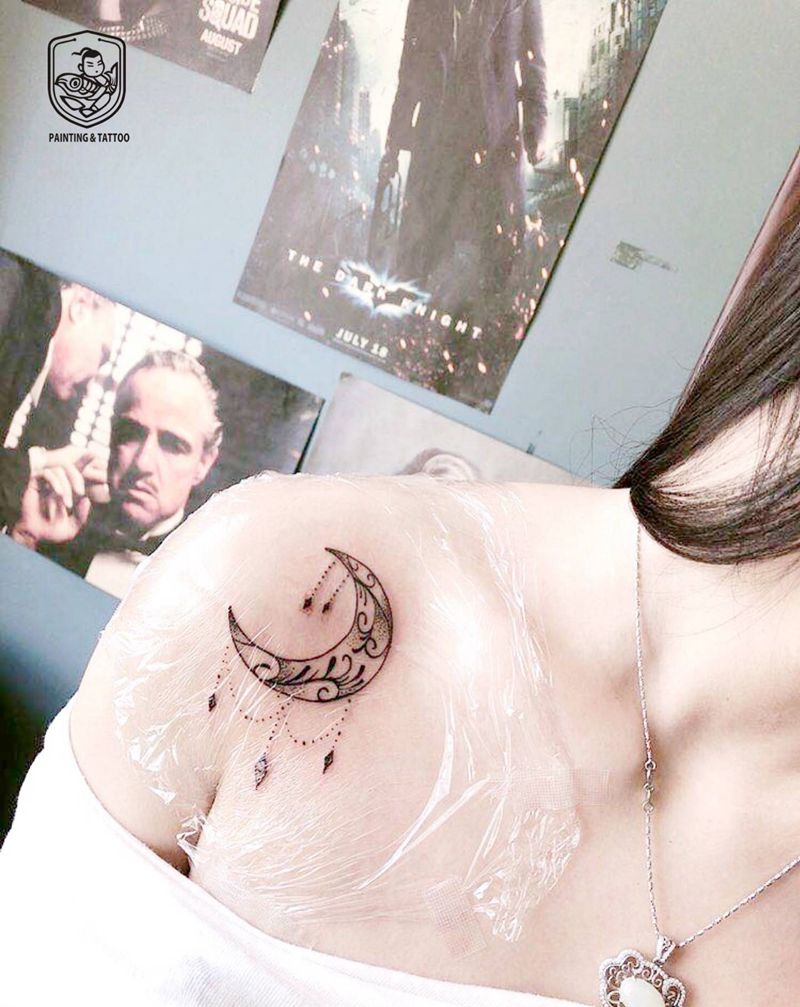 月亮纹身图片_肩部点刺几何月亮纹身图案