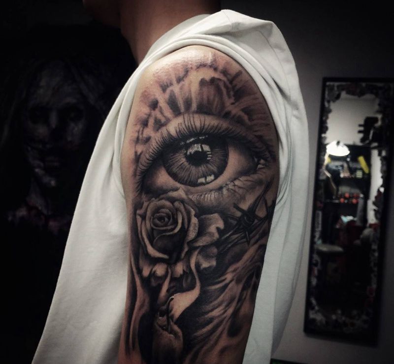 • 手背潮流时尚的玫瑰花眼睛纹身图案
