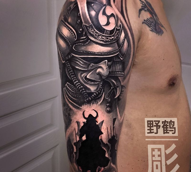 当前位置: 首页 >山东省青岛市纹身店-鬼啸堂刺青工作室纹身图案>武士纹身图片_手臂肩部欧美写实纹身图案