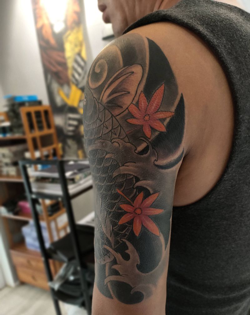 大臂鲤鱼遮盖纹身图片_手臂纹身图案