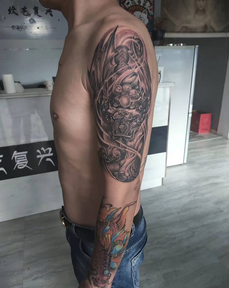 当前位置: 首页 >山东省青岛市纹身店-纹艺复兴纹身机构纹身图案>花臂拼接未完成纹身图片_手臂纹身图案