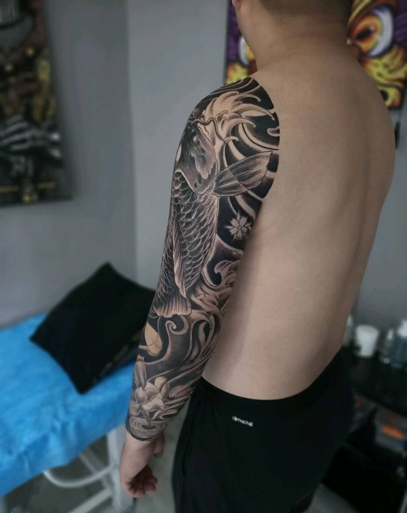 当前位置: 首页 >山东省青岛市纹身店-纹艺复兴纹身机构纹身图案>花臂鲤鱼纹身图片_臀部纹身图案