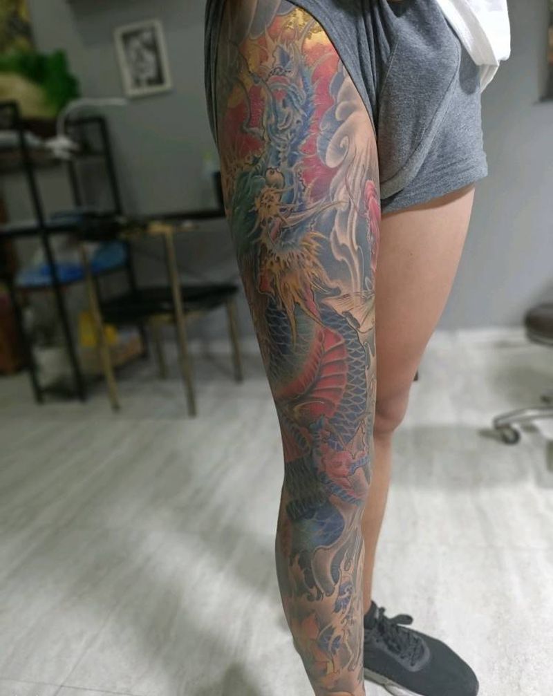 • T网红王老大花腿龙纹身图片_腿部新传统纹身图案