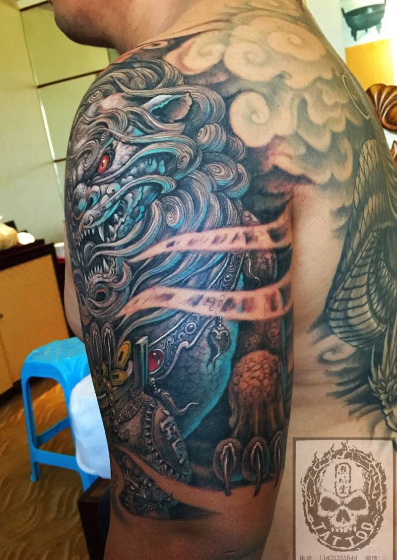 当前位置: 首页 >山东省淄博市纹身店-烈焰堂纹身纹身图案>唐狮纹身图片_成品肩部传统原创动物神兽纹身图案