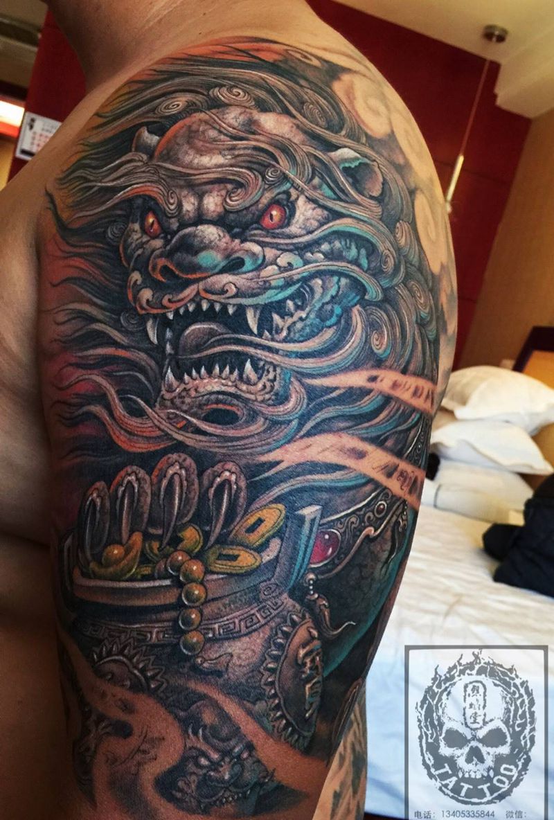 唐狮纹身图片_成品肩部传统原创动物神兽纹身图案