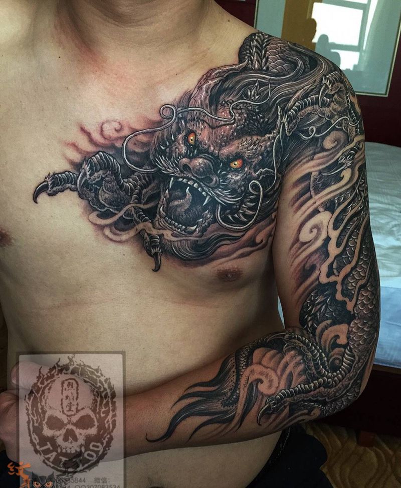 过肩龙花臂纹身图片_肩部胸部手臂成品传统欧美动物鬼神宗教图腾纹身图案