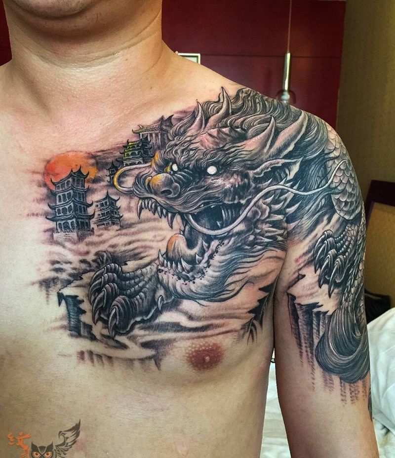 过肩麒麟纹身图片_成品肩部胸部手臂欧美传统宗教动物写实纹身图案