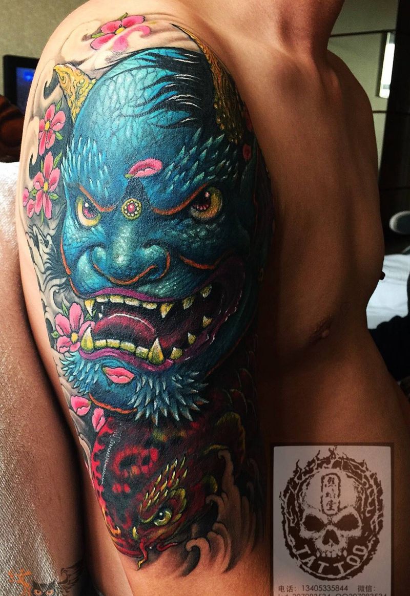 超黑遮盖 般若纹身图片_成品肩部传统鬼神人物原创宗教纹身图案
