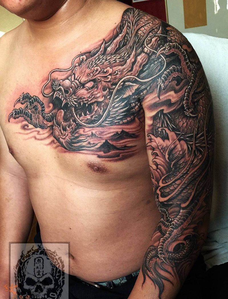 当前位置: 首页 >山东省淄博市纹身店-烈焰堂纹身纹身图案>过肩龙纹身图片_成品肩部胸部手臂传统原创动物鬼神宗教纹身图案