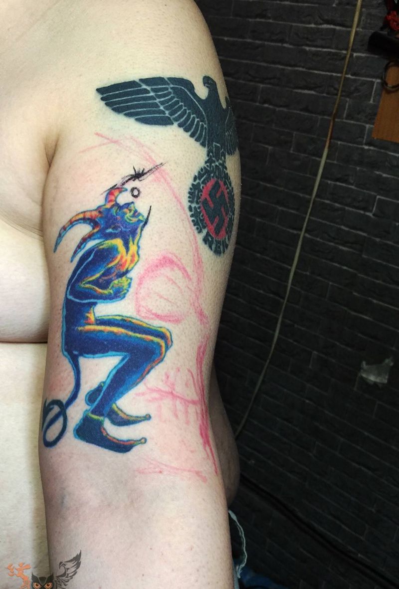 当前位置: 首页 >山东省淄博市纹身店-烈焰堂纹身纹身图案>遮盖 小丑纹身图片_成品肩部手臂欧美原创遮盖作品字符几何动物宗教纹身图案