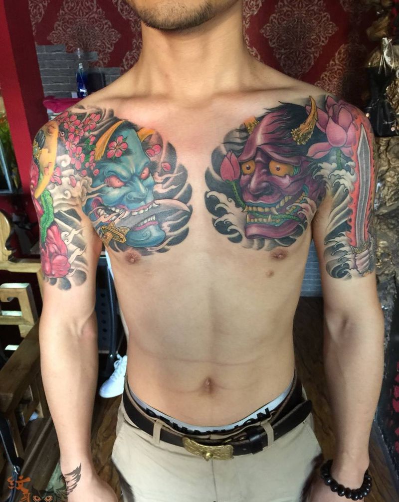 当前位置: 首页 >山东省淄博市纹身店-烈焰堂纹身纹身图案>双甲纹身图片_成品肩部胸部手臂肖像原创宗教人物鬼神传统纹身图案