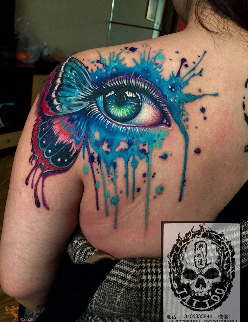 当前位置: 首页 >山东省淄博市纹身店-烈焰堂纹身纹身图案>水彩蝴蝶眼睛纹身图片_成品肩部欧美清新写实动物人物图腾原创纹身图案