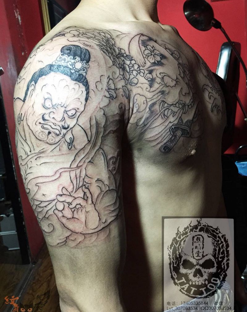 当前位置: 首页 >山东省淄博市纹身店-烈焰堂纹身纹身图案>打底色双甲纹身图片_传统原创人物宗教纹身图案
