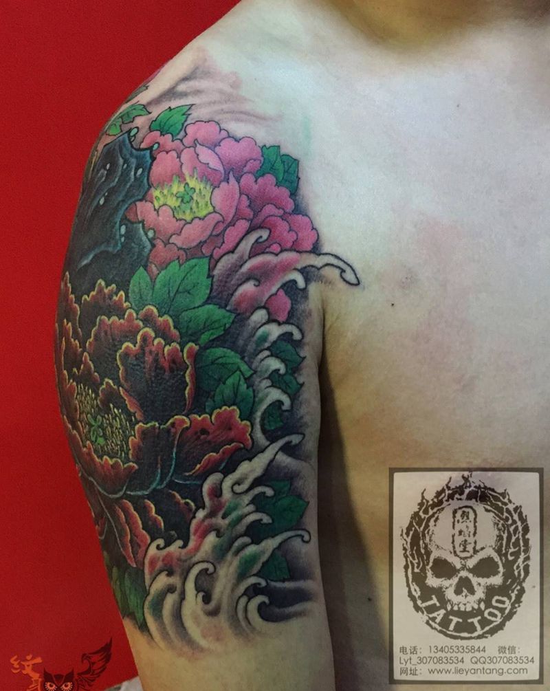 牡丹盖图腾纹身图片_成品肩部传统植物原创遮盖作品纹身图案