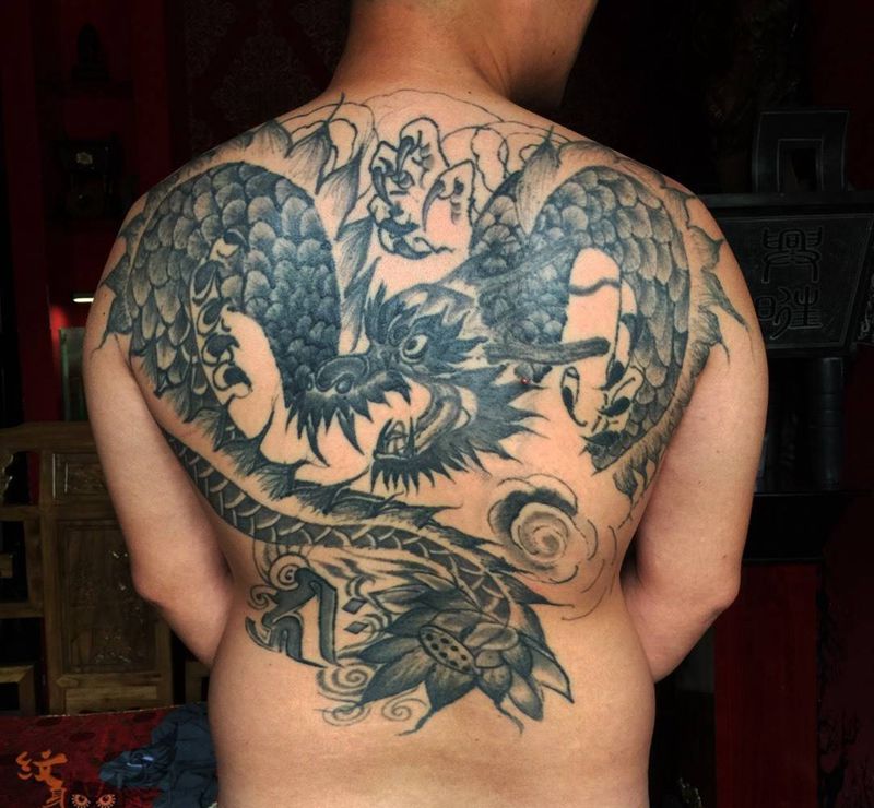 后背大龙遮盖纹身图片_背部传统原创神兽遮盖作品纹身图案