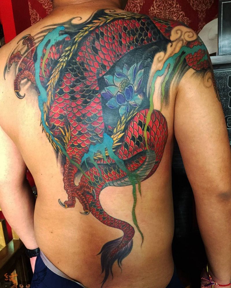 当前位置: 首页 >山东省淄博市纹身店-烈焰堂纹身纹身图案>遮盖大龙纹身图片_成品肩部背部胸部传统原创遮盖作品神兽纹身图案
