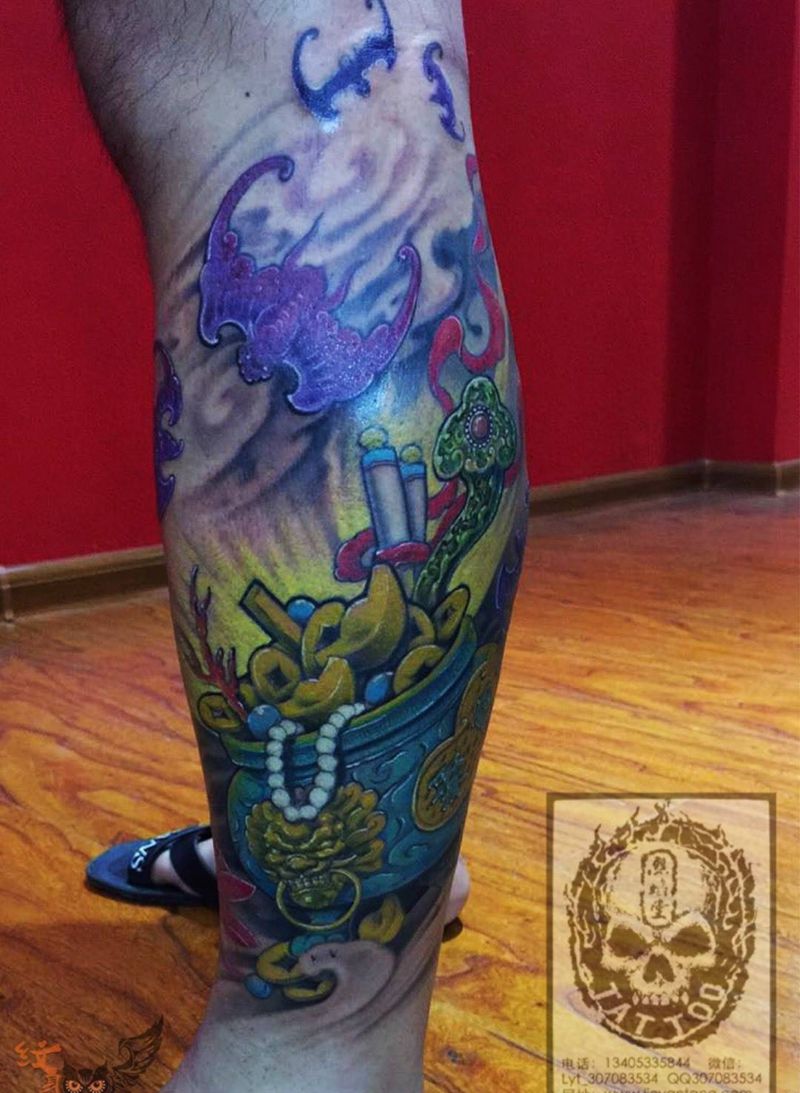 五福聚宝纹身图片_成品腿部传统原创动物人物宗教静物纹身图案