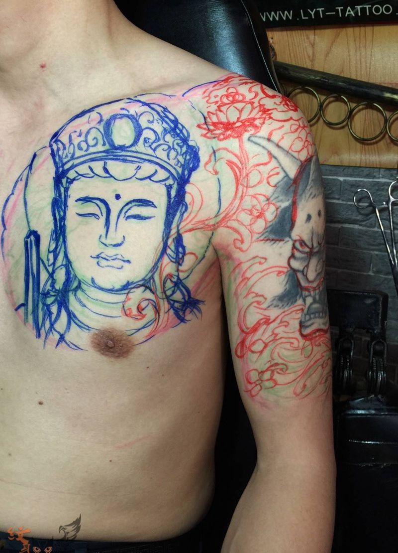 大势至菩萨般若纹身图片_胸部肩部手臂肖像传统原创遮盖作品修改宗教纹身图案