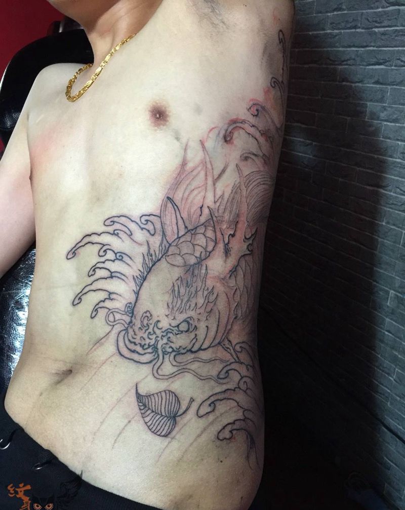 当前位置: 首页 >山东省淄博市纹身店-烈焰堂纹身纹身图案>线条锦鲤纹身图片_腰部传统原创动物纹身图案