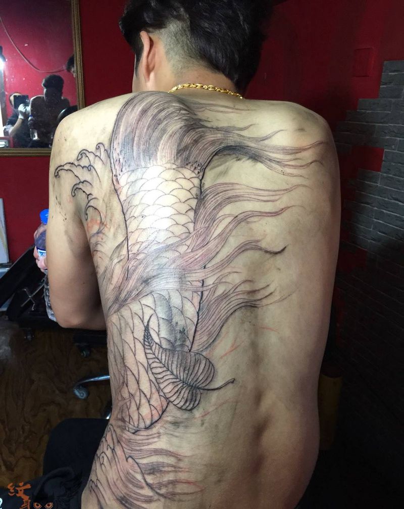 当前位置: 首页 >山东省淄博市纹身店-烈焰堂纹身纹身图案>线条锦鲤纹身图片_腰部传统原创动物纹身图案