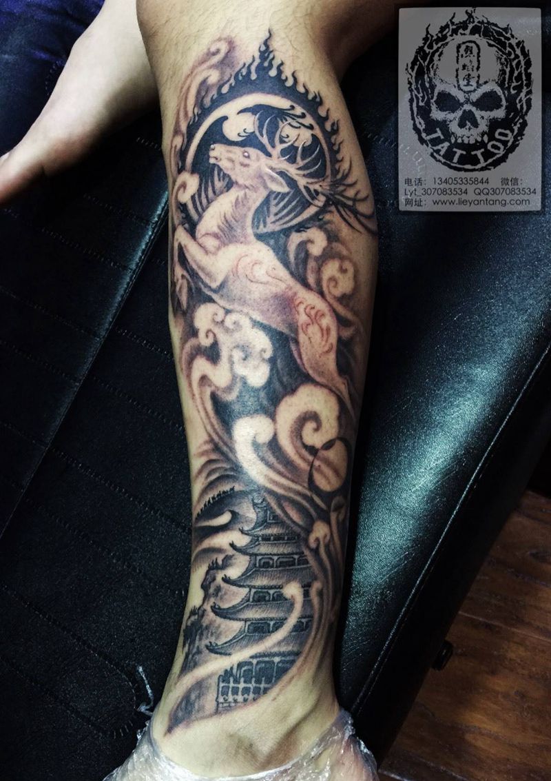 鹿王九色鹿纹身图片_成品腿部传统欧美原创神兽动物纹身图案