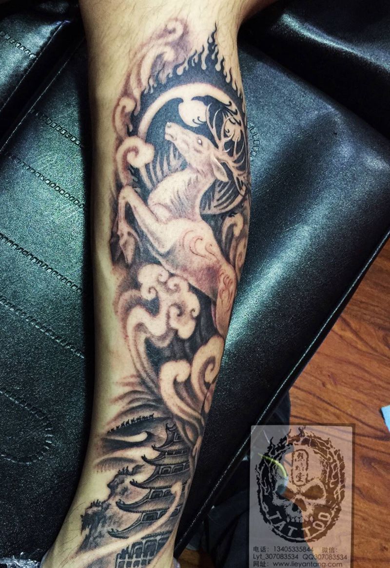 鹿王九色鹿纹身图片_成品腿部传统欧美原创神兽动物纹身图案