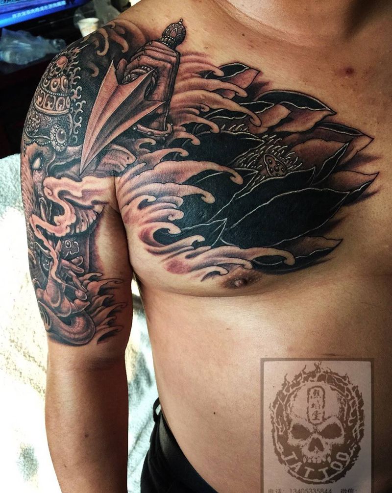 当前位置: 首页 >山东省淄博市纹身店-烈焰堂纹身纹身图案>象神莲花纹身图片_成品胸部肩部传统动物原创遮盖作品神兽宗教纹身图案