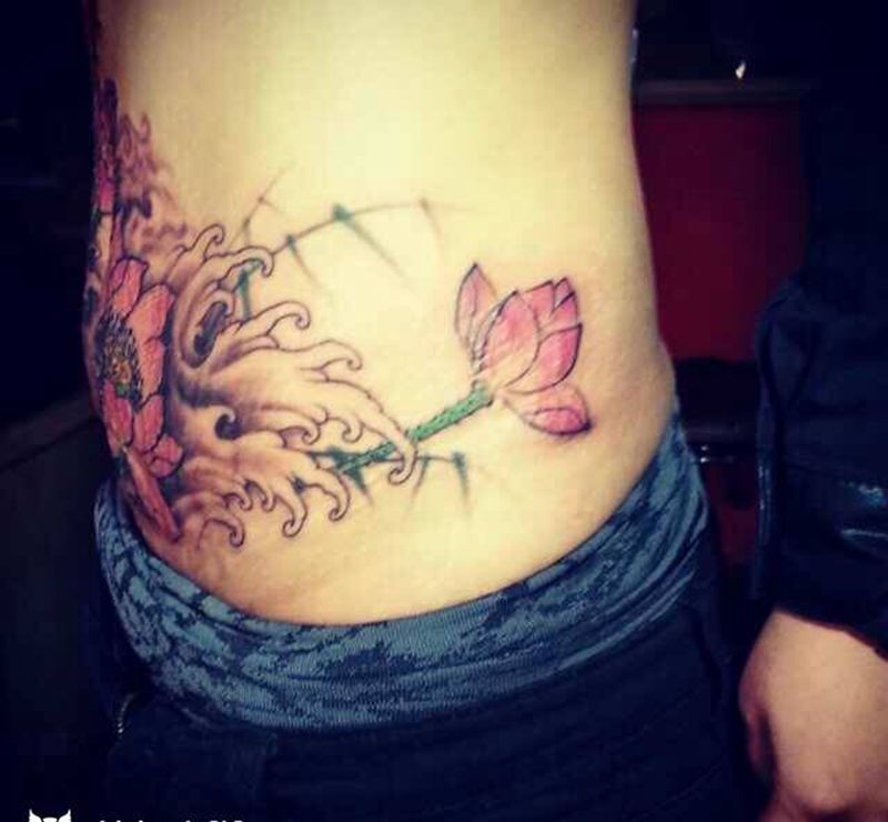 莲花纹身图片_成品遮盖作品腹部传统原创植物纹身图案