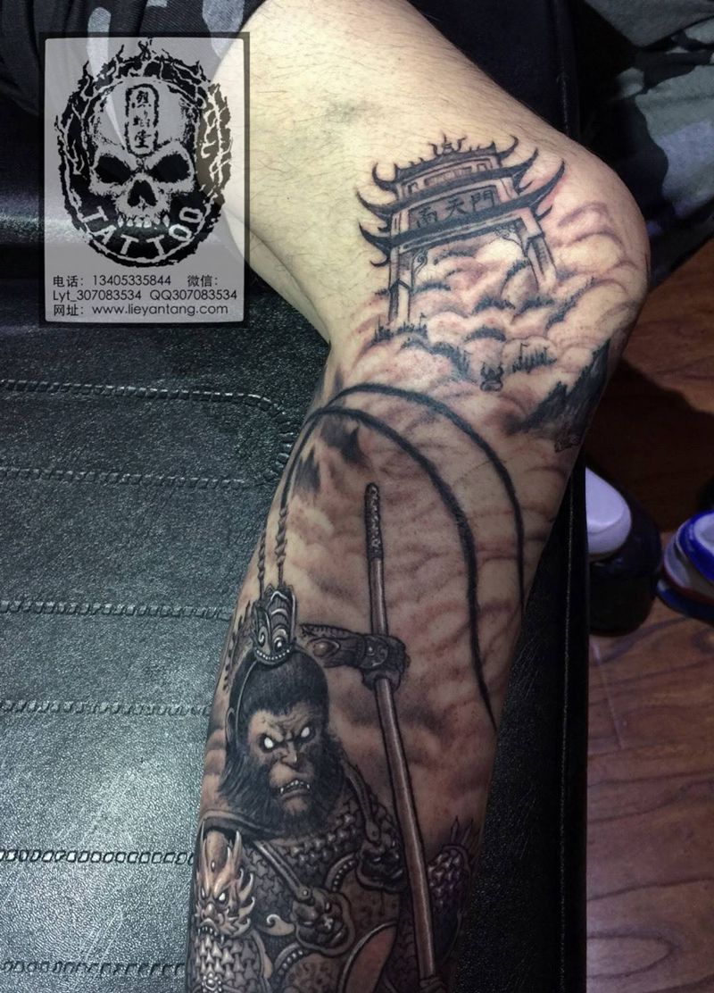 猴子大战三太子纹身图片_成品腿部传统原创鬼神宗教人物纹身图案