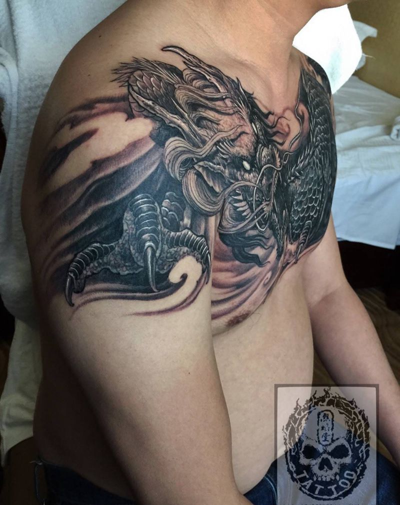 当前位置: 首页 >山东省淄博市纹身店-烈焰堂纹身纹身图案>暴力遮盖龙纹身图片_成品胸部背部传统动物原创神兽遮盖作品纹身图案