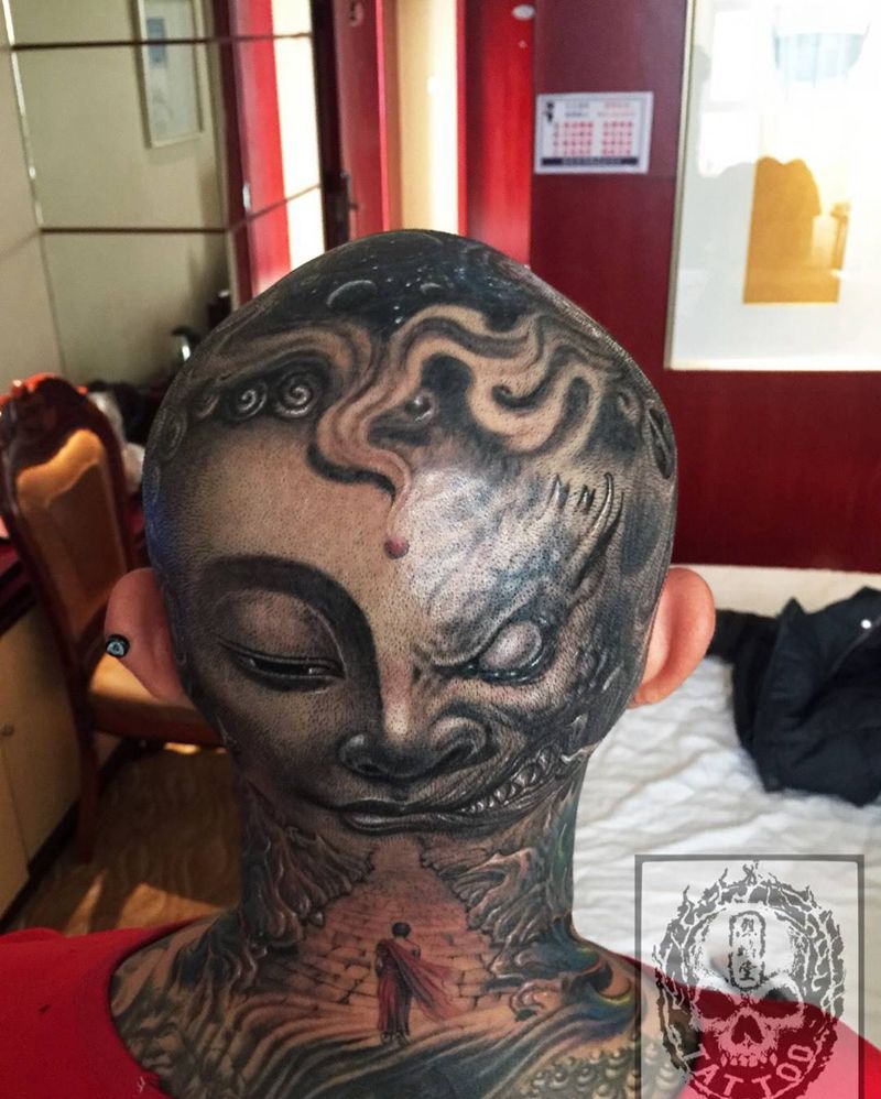 当前位置: 首页 >山东省淄博市纹身店-烈焰堂纹身纹身图案>包头纹身图片_成品颈部欧美传统肖像写实原创人物鬼神纹身图案