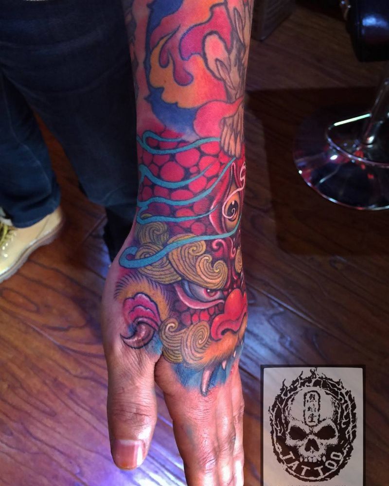 当前位置: 首页 >山东省淄博市纹身店-烈焰堂纹身纹身图案>手背唐狮纹身图片_成品手部传统动物原创神兽纹身图案